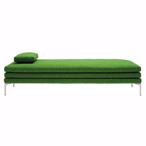 Armchair, monobloc, modular sofas, pouf, day bed and shelves. Aluminum alloy feet, either polished or with natural or black nickel-satin finish, or black painted. Steel frame. Elastic strips suspension. Upholstery in polyurethane/ heat-bound polyester fibre. Seat, back and armrest cushions upholstered with goose down. Removable fabric or leather cover. The lounge chairs without armrest and the end-sofas are fit to arrange a solid wood shelf, in natural or grey painted oak or in natural painted Canaletto walnut. Shelf supports in polished, with natural or black nickel- satin finish, or black painted aluminum.