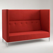 Low back sofas, High booths, High back banquette and Ottoman seating. Upholstered family of single, two or three seater units constructed from timber, steel springs and polyurethane foams. Cast aluminium legs and extruded aluminium rails.