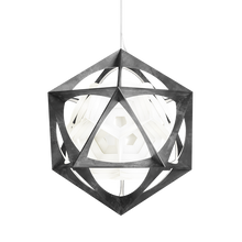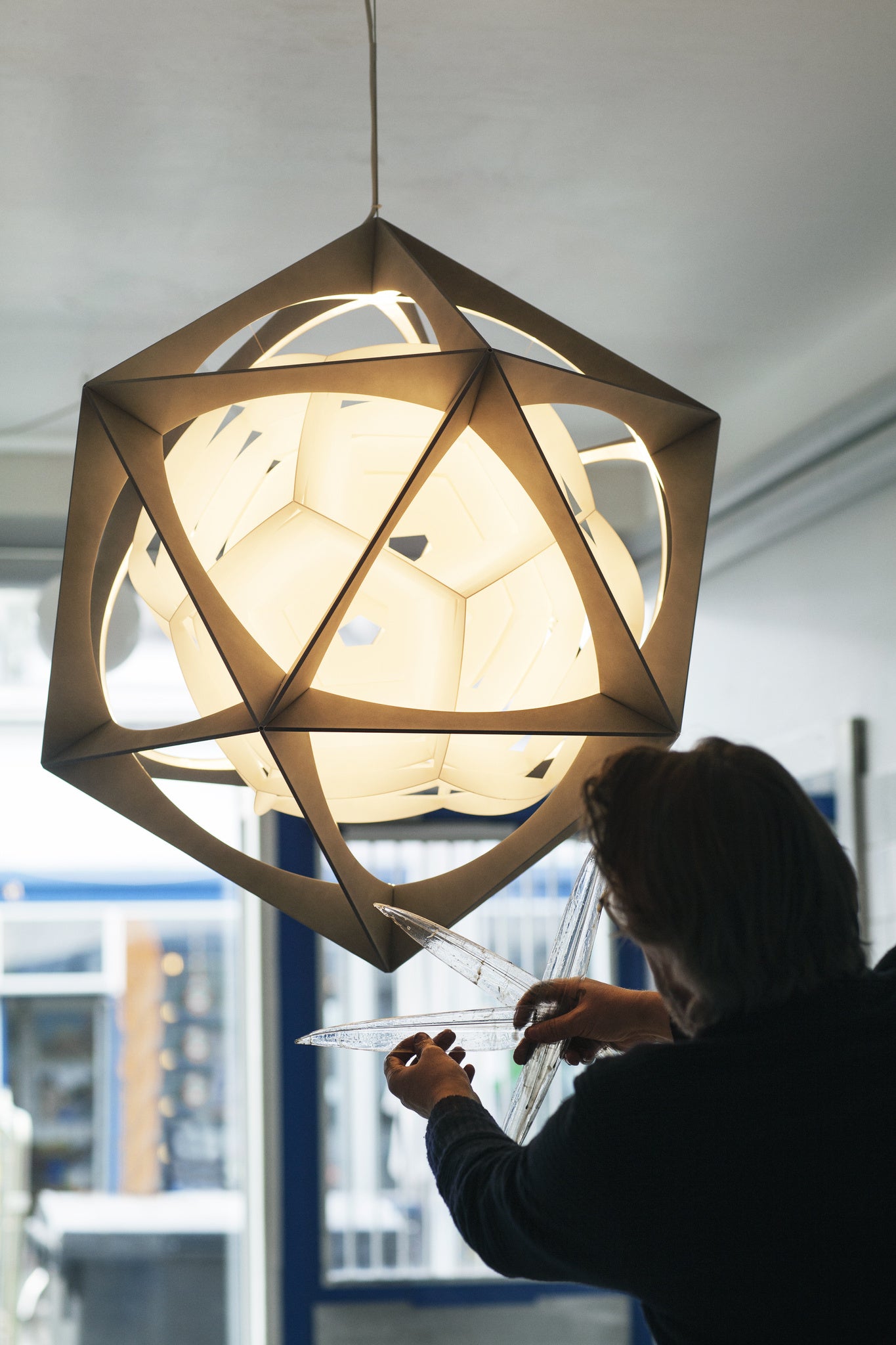 The pendant has 12 LEDs embedded in the inner vertices of the geometric frame that are connected to light guides along the inner edges, creating an even illumination towards the reflector in the centre of the lamp. This layered white reflector emits the light spherically back into the room, resulting in a glare-free uniform light.