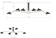 Ceiling Lamp 6 Rotating Arms designed by Serge Mouille is a ceiling lamp, the original 1958 model reissue. It have 6 rods steel painted black, reflectors made of black lacquered aluminum with white interiors, the joints of brass. Light bulb: E27 6x42W halogen (included).