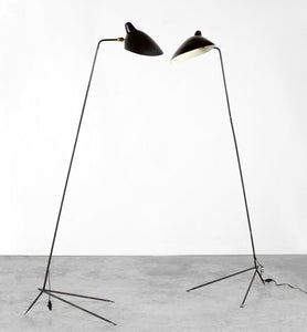 Standing Lamp 1 Arm designed by Serge Mouille is a floor lamp, the original 1953 model reissue. It have 1 fixed arm steel painted black, the reflector made of black lacquered aluminum with white interior, the joint of brass and it is possible to rotate the arm up to 270° and inclination of the reflector up to 55°. Light bulb: 1x E27 42W halogen (included) - cable foot switch.
