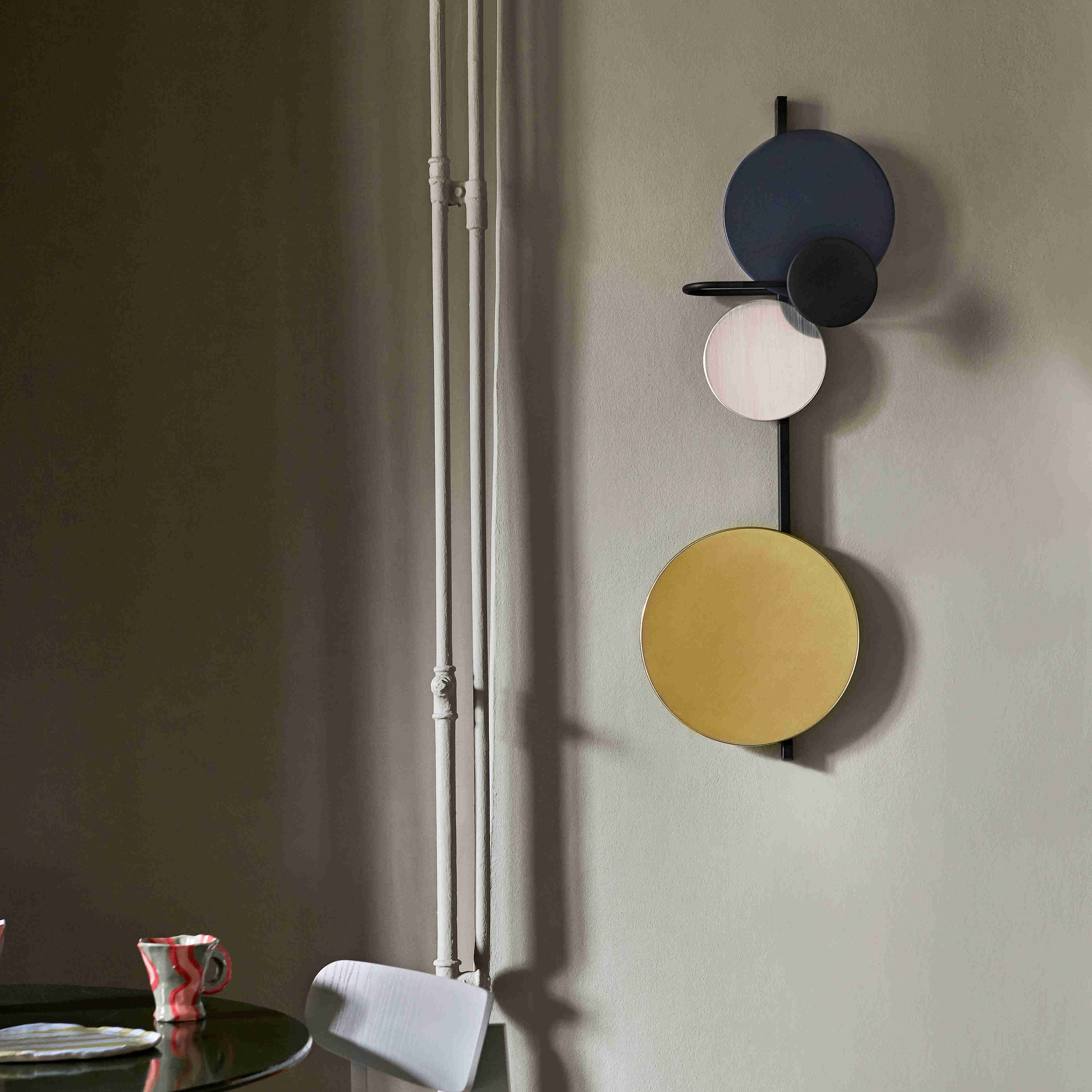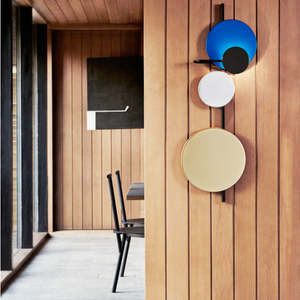The discs are attached by magnets and can therefore be moved around to your liking. The indirect ambient halogen light appears soft and creates shadows on the wall according to how the disks are attached to the main steel bar.