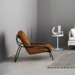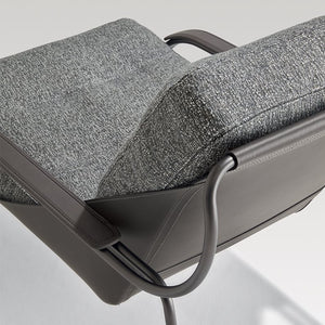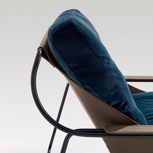 Maggiolina armchair, design by Marco Zanuso for Zanotta with frame in 18/8 stainless steel, satin or painted black. The cowhide sling is available in a variety of colors. The goose down upholstery of the back cushion ensures maximum softness, while the seat cushion made of polyurethane/Dacron Du Pont for firmness. The covers for the cushions and the armrests are available both in leather or foe leather.
