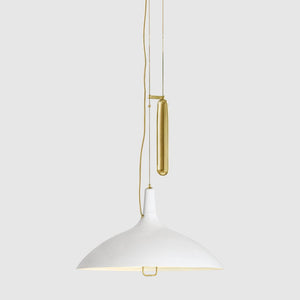 Unveiled in 1947 at the Finland House in New York, the A1965 Pendant was an instant success for Paavo Tynell and one of the lighting fixtures considered to define his mid-century peak. It delicately holds some of his most distinctive design traits; the perforated and polished brass material combined with a unique lift mechanism, raising and lowering the lamp to different heights. The A1965 Pendant gracefully diffuses the light downwards through frosted glass, omitting glare whilst gently illuminating the room. The hanging counterweighted A1965 Pendant was Tynell’s attempt to add lighting mobility to the ceiling fixture and combing the advantages of the portable and the installed lamp. The impeccable construction of the A1965 Pendant fully reveals Paavo Tynell’s knack for elevating ordinary light fixtures into functional art and this remarkable style played a significant role in shaping the aesthetic of mid-century lighting.