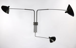 Sconce with three rotating straight arms, designed by Serge Mouille, is a wall lamp, the original 1954 model reissue. It has 3 rods steel painted black, the reflectors are made of black lacquered aluminum with white interiors, the joints of brass. Light bulbs: E27 3x42W halogen (included).