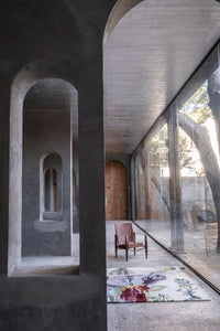 Backyard is a literal representation of one of Moix's works, in which the original piece has been transferred as reliably as possible to a rug. Its name refers to the natural space behind a house, where the flora is wilder. Hence it is a mural with a messier approach where flowers are presented on a spectacular scale. Its lines in low relief reflect the pencil sketches of the painting.