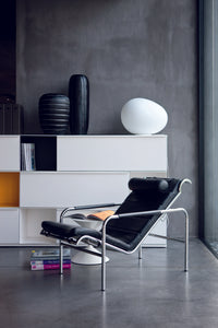 Lounge chair. Chromium-plated steel frame or with natural or black nickel-satin finish, or black painted. Suspension on steel springs. Adjustable seat in two positions. Cushion and headrest upholstered in polyurethane. Leather-covered cushions and armrests.