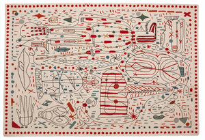 A first glance reveals a chaotic tangle of colours and shapes that invade the rug. However, after looking carefully, the imagination of Jaime Hayon springs to life: turtles, lips, hands, stools, fish, half men – half birds…