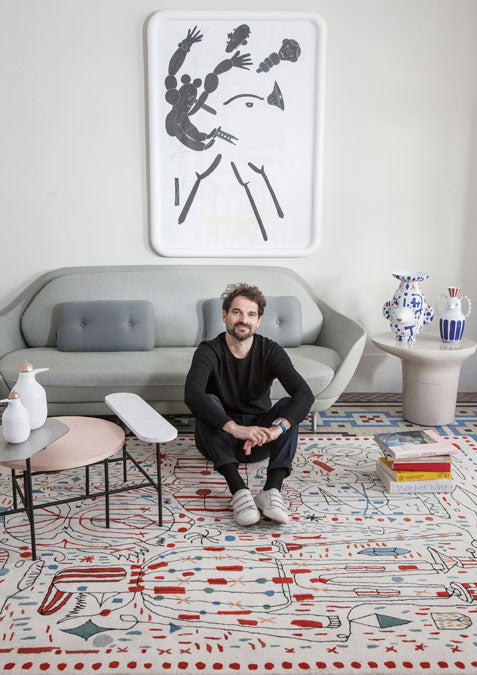 A first glance reveals a chaotic tangle of colours and shapes that invade the rug. However, after looking carefully, the imagination of Jaime Hayon springs to life: turtles, lips, hands, stools, fish, half men – half birds…