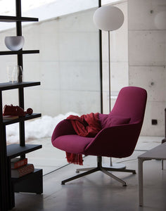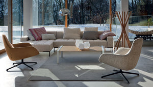 Armchair/bergere, pouf. Revolving base in varnished steel, colors: black, chrome or graphite. Steel frame. Upholstery in self-extinguishing graduated polyurethane foam/heat-bound polyester fiber. Removable fabric or leather cover.