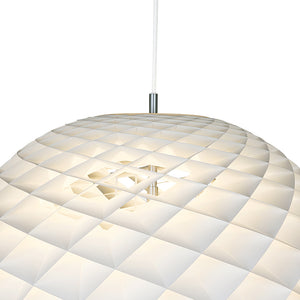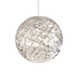 The pendant is a glowing sphere built up of small diamond-shaped cells. Each cell is carefully designed to capture light and to shield the light source from the viewing angles above 45 degrees. Each cell glows. Below 45 degrees, the fields are open to direct light downwards. A small amount of light is also sent upwards to illuminate the ceiling.