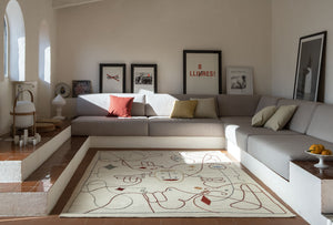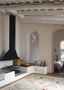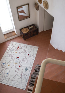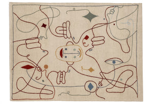 Depicted with a delicate stroke, the illustration defines the silhouettes of several imaginary characters that intertwine and coexist in a beautiful composition. Hayon subtly introduces color through small elements brimming with personality that help to interpret each of the images. Nine faces are distributed at different angles so that the rug can be viewed from any perspective, fitting perfectly in any space.