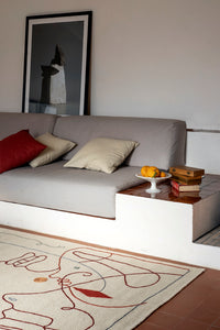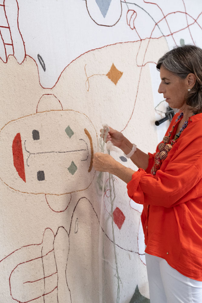 nanimarquina introduces the embroidery on kilim technique for the first time, a laborious process handmade in Pakistan where the chain stitch embroidery adds texture and a soft volume that emphasizes the sinuousness of the illustration. Despite its delicate appearance, it is a sturdy technique suitable for both residential and commercial use. Available in two standard sizes, the indoor model also includes a tapestry piece that can be hung vertically.