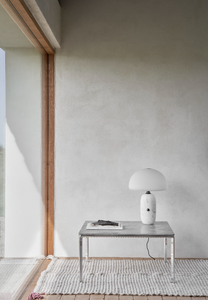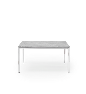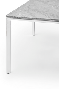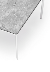 The new design adds high-quality materials and refined detailing to the living space. The hardiness and mirror effect of the polished aluminium contrasts the natural stoneware that elegantly parallels the softly curved corners of the table frame.