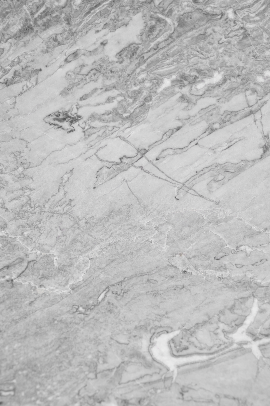 The smaller rectangular table features a sky-grey marble top with shades of grey varying from almost white to dark grey. A bush-hammered finish adds white spots and intended dents to the surface, creating an organic and tactile experience.